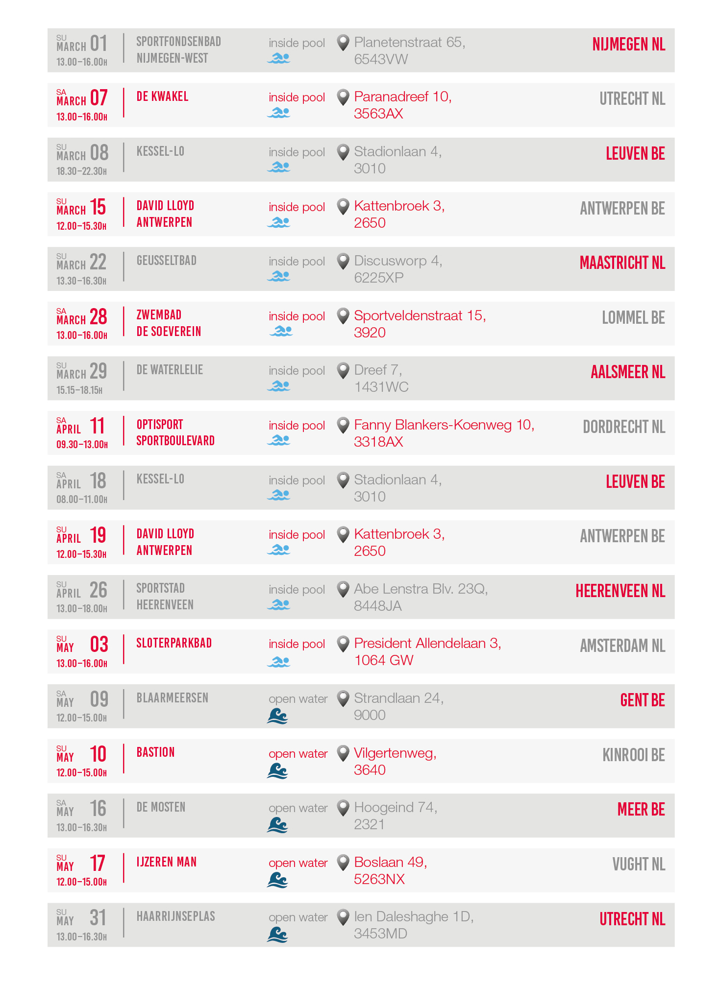 Every year we organize several wetsuit test days in different great locations in The Netherlands and Belgium. For example; an outdoor swimming pool, natural water or an indoor swimming pool.